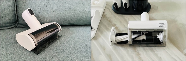 ▼地板地砖的电动吸头,细节方面可圈可点。滚刷软绒材质,手感柔软不伤地面;连接处软管设计,可调节角度大,方便进入狭窄位置;底部辅助小滚轮设计,使用中更省力。
