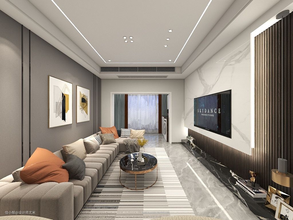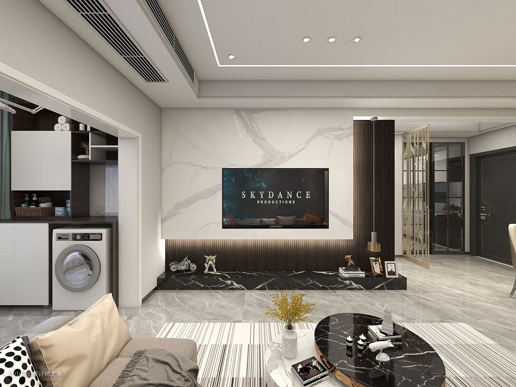 使用的是风管机,风管机其实跟柜机价格差不多,但是颜值更高,不占地面空间。电视背景使用的是大板砖,纹理使用的是爵士白。底下使用的是木格栅,周围布置了灯带增加氛围感。右边设计了鱼线吊灯,通过金色不锈钢灯罩与背景产生材质的对比,增加空间的层次和时尚感。