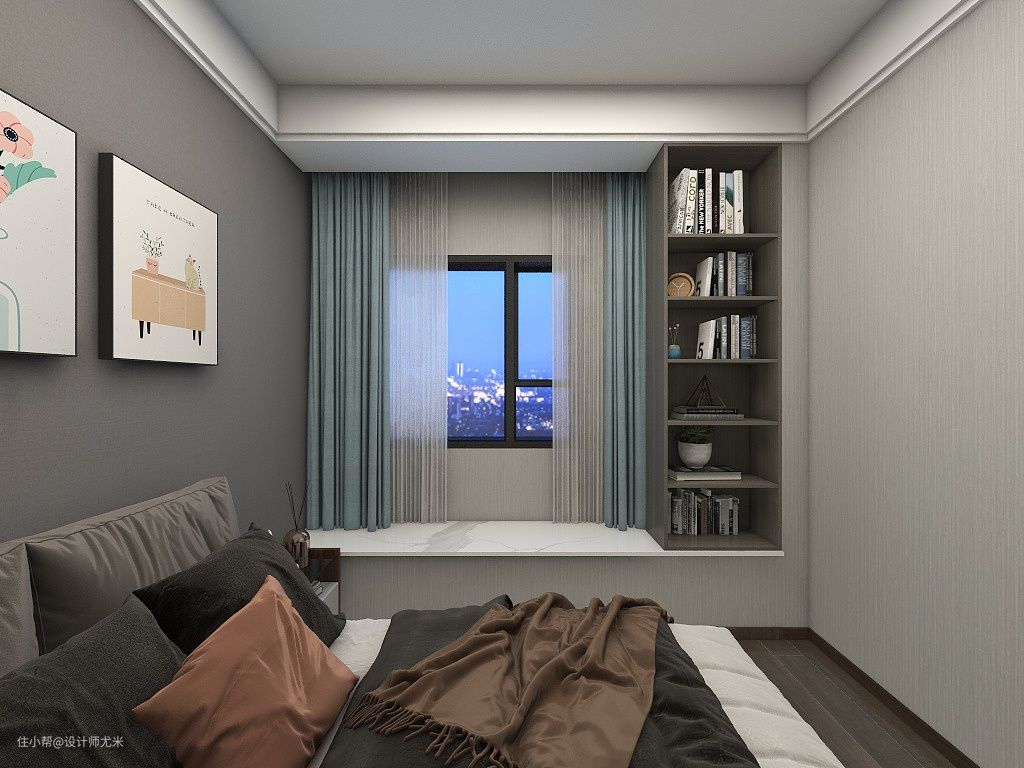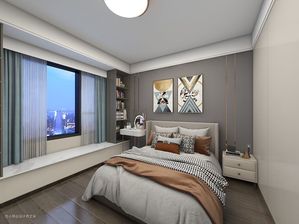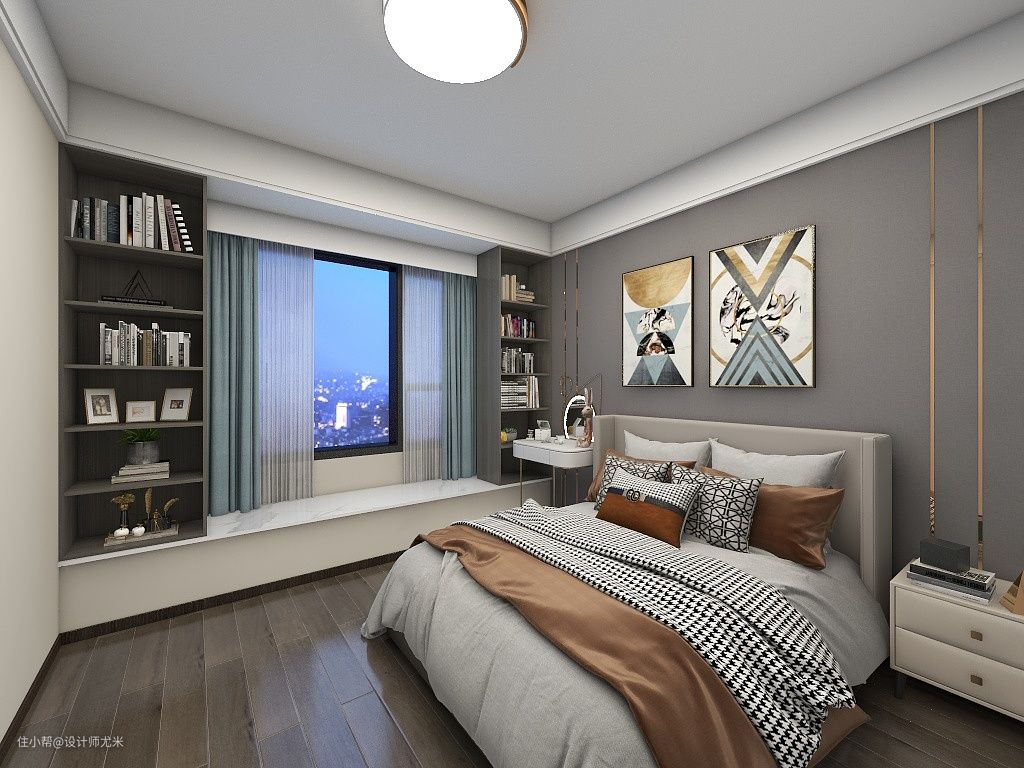 飘窗有70公分深,为了增加收纳空间,那飘窗两边也利用起来,做两个书柜,提升整个主卧的颜值。