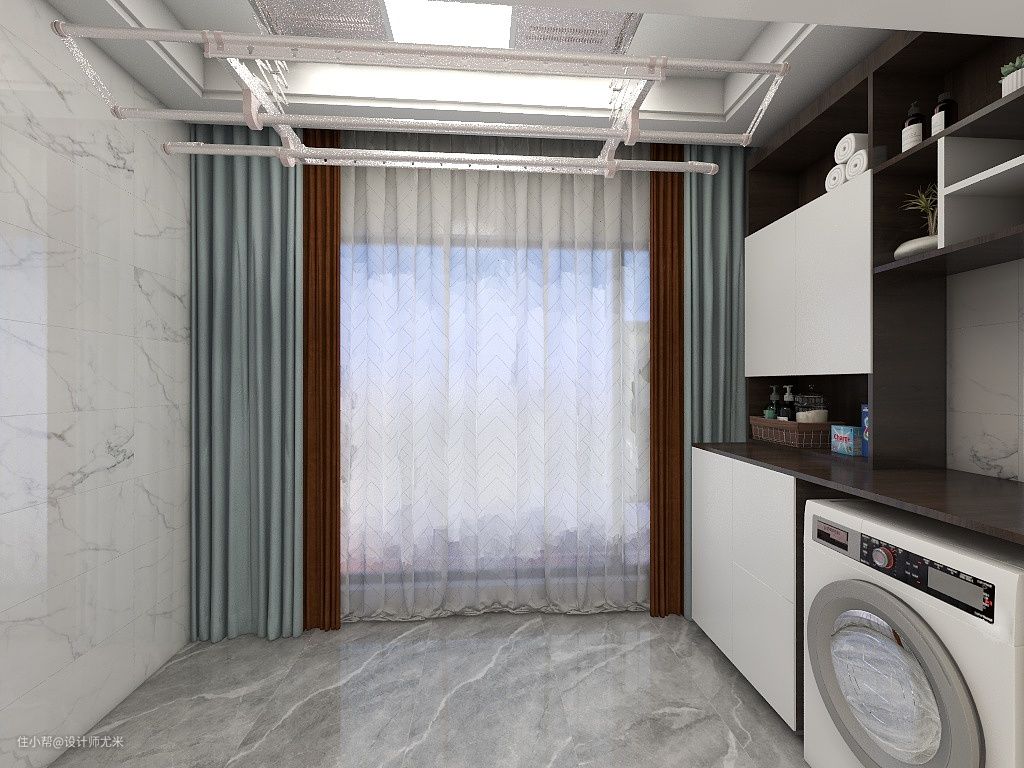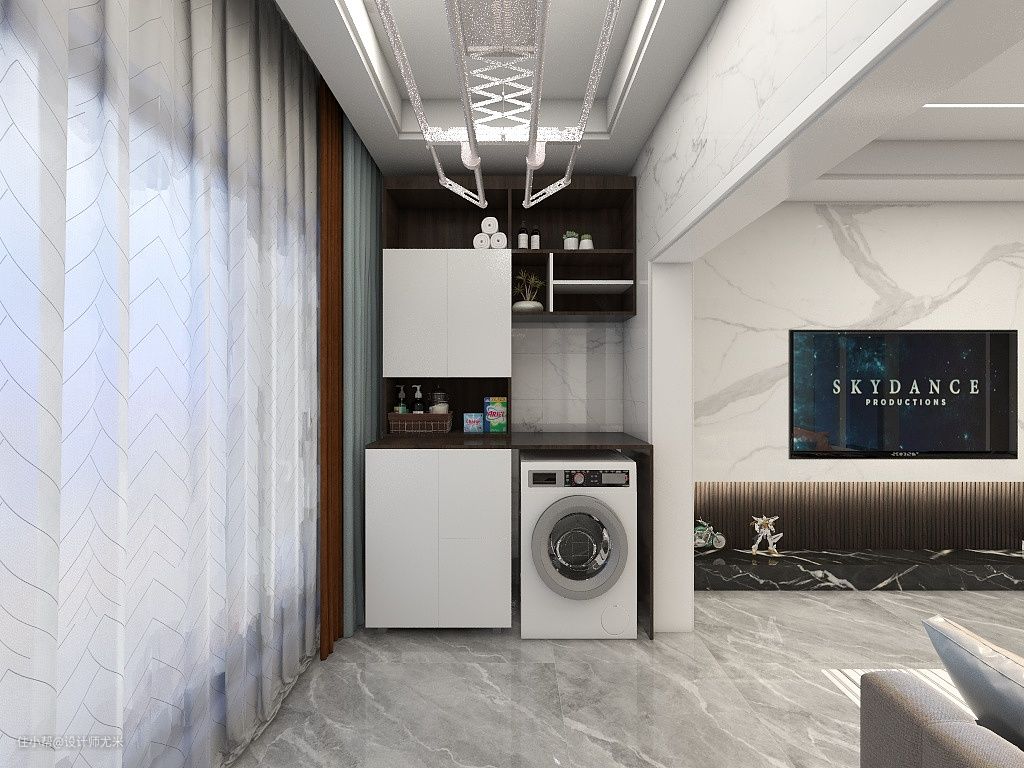 因为整个房间只有一个阳台,所以把洗衣机设计在阳台上面,更合理的利用空间。定制一个整体的洗衣机柜,既提升了整个阳台的颜值,也增加了收纳空间。洗衣机柜上面可以放一些洗衣粉,还可以摆一些绿植。下面柜子还可以放一些不常用工具。