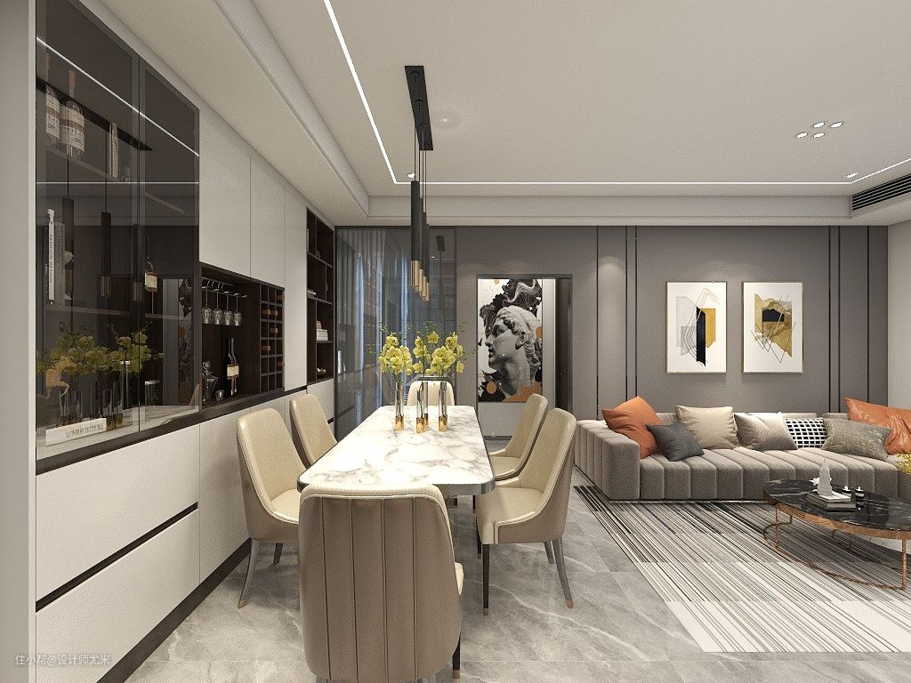 鞋柜与酒柜做成一排,刚好填平了入户承重墙凹进去的位置,也解决了收纳的问题。柜门采用铝框玻璃门,增加时尚感,也更显通透和层次。
