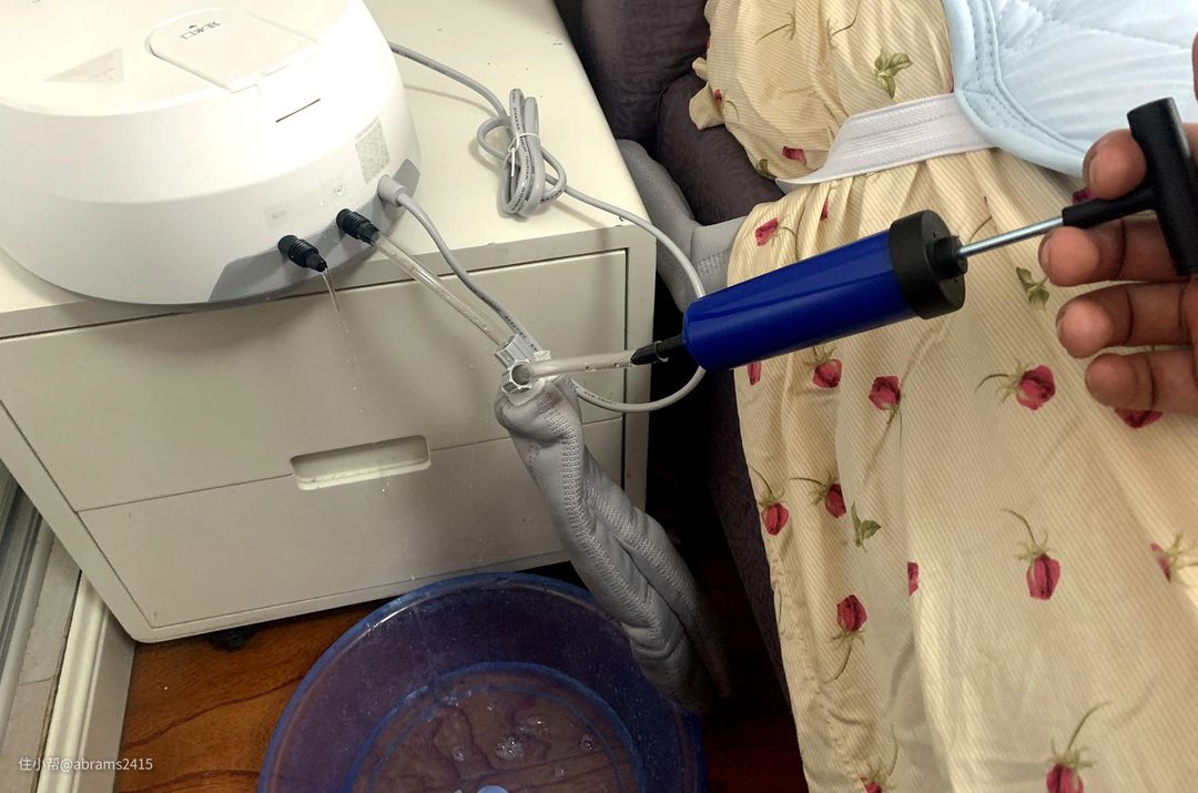 ▲换季恒温床垫不使用,需用附带的吹气管把水管一段注射空气,水从另一端流出。流干净后床垫可进行折叠收纳。比传统电热毯要繁琐一些。