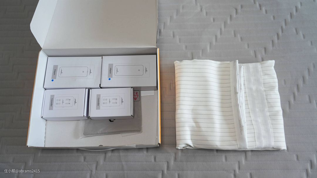 ▲这款碳纤维电热毯采用双区双控温方式,所以盒子内有两套电源适配器和控制器。