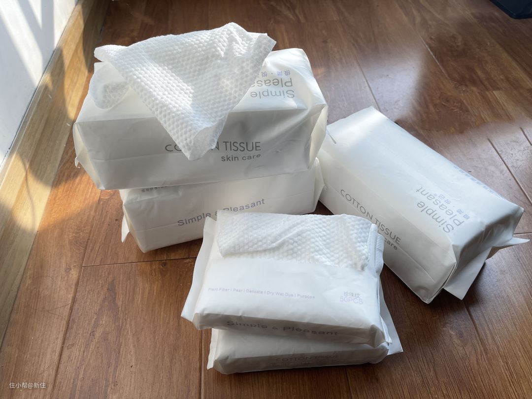 其实成本,跟我们正确用毛巾比,其实还要低。因为一般建议两到三个月换一次毛巾。一条普通的毛巾10块钱,一年换5条也要50。而用洗脸巾,以新住的洗脸巾为例,300片20出头,而这300片如果节俭一点用,能用2年。