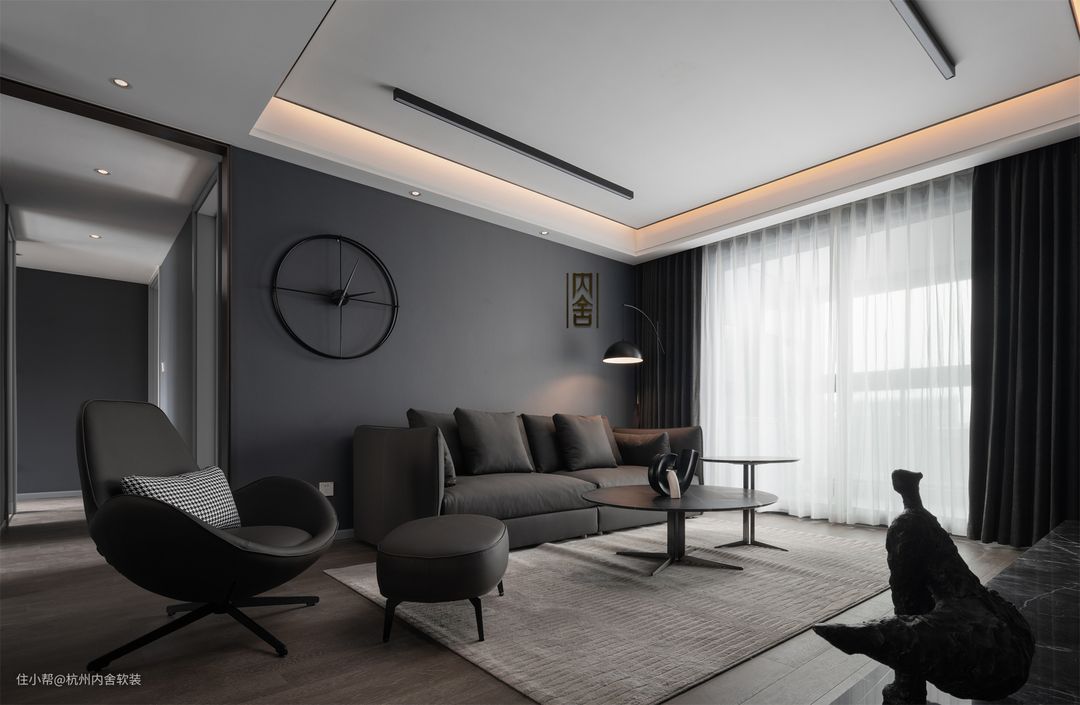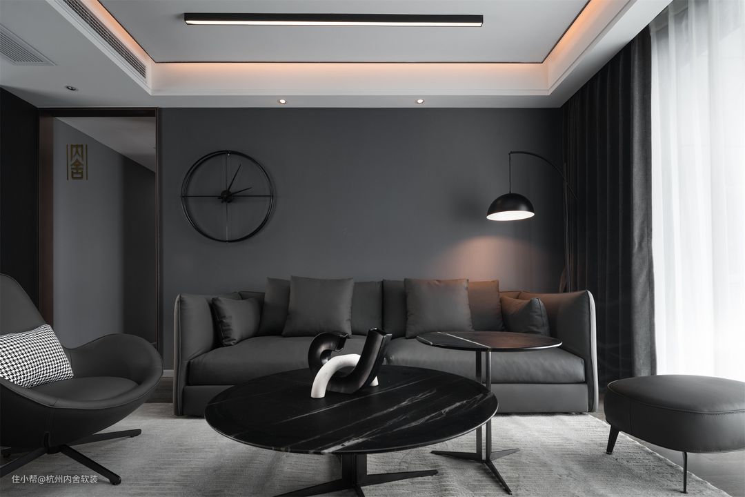 客厅选用黑与灰为基色展开设计,在家具的搭配选择上与背景同色系,气场十足且使空间更显高级质感。