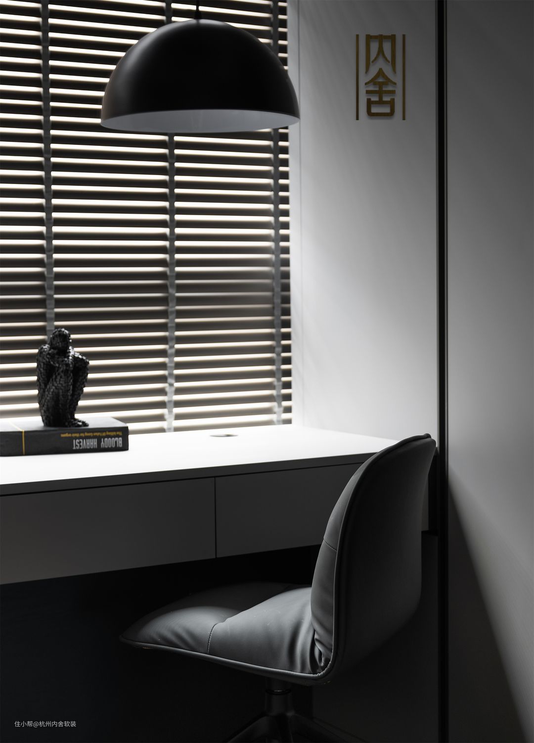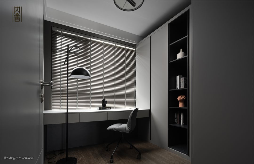 书房整体选用灰调做设计,百叶窗+柜体书桌打造办公区域,定制柜体满足了屋主的收纳需求,沉稳不显压抑 是最好的释放。