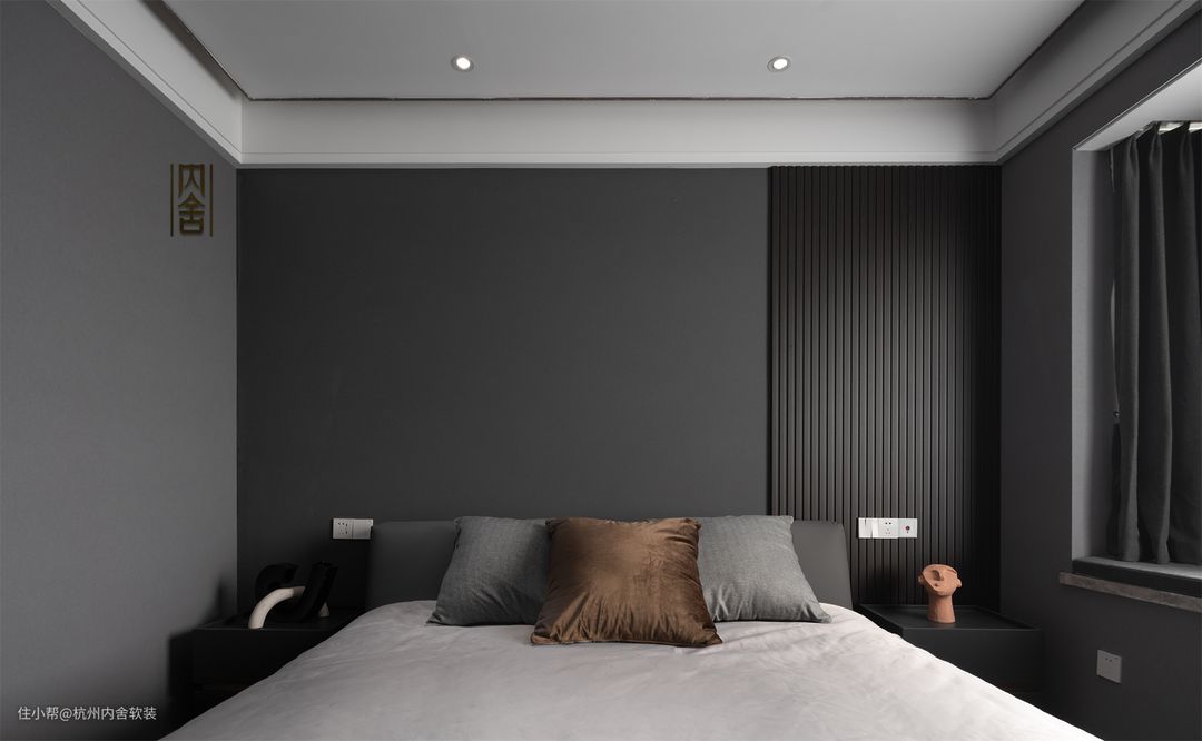 深灰墙布+黑色长城板的背景墙,搭配同色系的床头+床头柜,扑面而来的冷酷感,橘调点缀空间整体简单又高级。