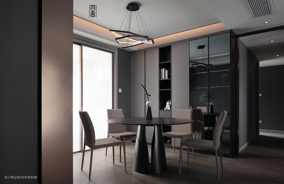 客餐厅同处于一个空间,中间以走道作划分,颜色的选择上由深到浅,营造一个高级质感的用餐氛围。