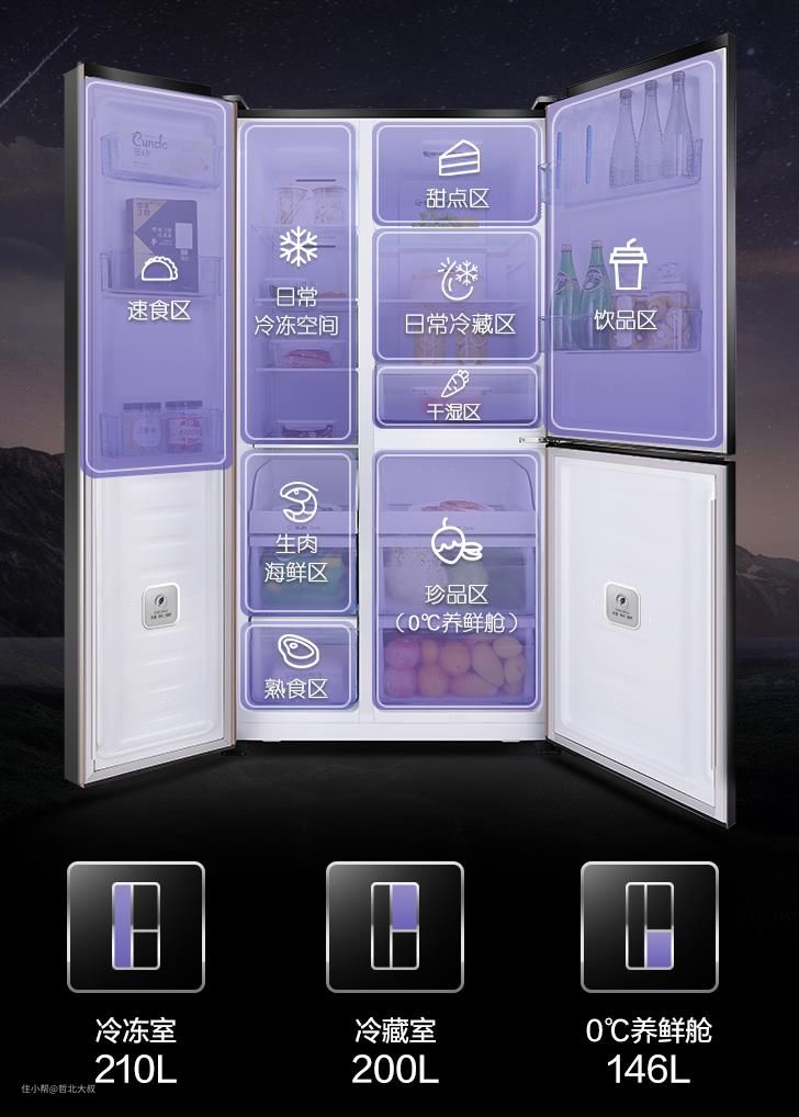 左侧整体冷冻区210升,速食、熟食、鲜肉、日常都进行了很好的区分,方便冷冻各种食品。左侧上部是200L的冷藏,下部146L的0度养鲜舱。想放啥就放啥,0度养鲜舱可以个性选择-7度到4度,进行自主调温,食材各有所属,智能温度封存新鲜滋味,享受原鲜不受时令所限。