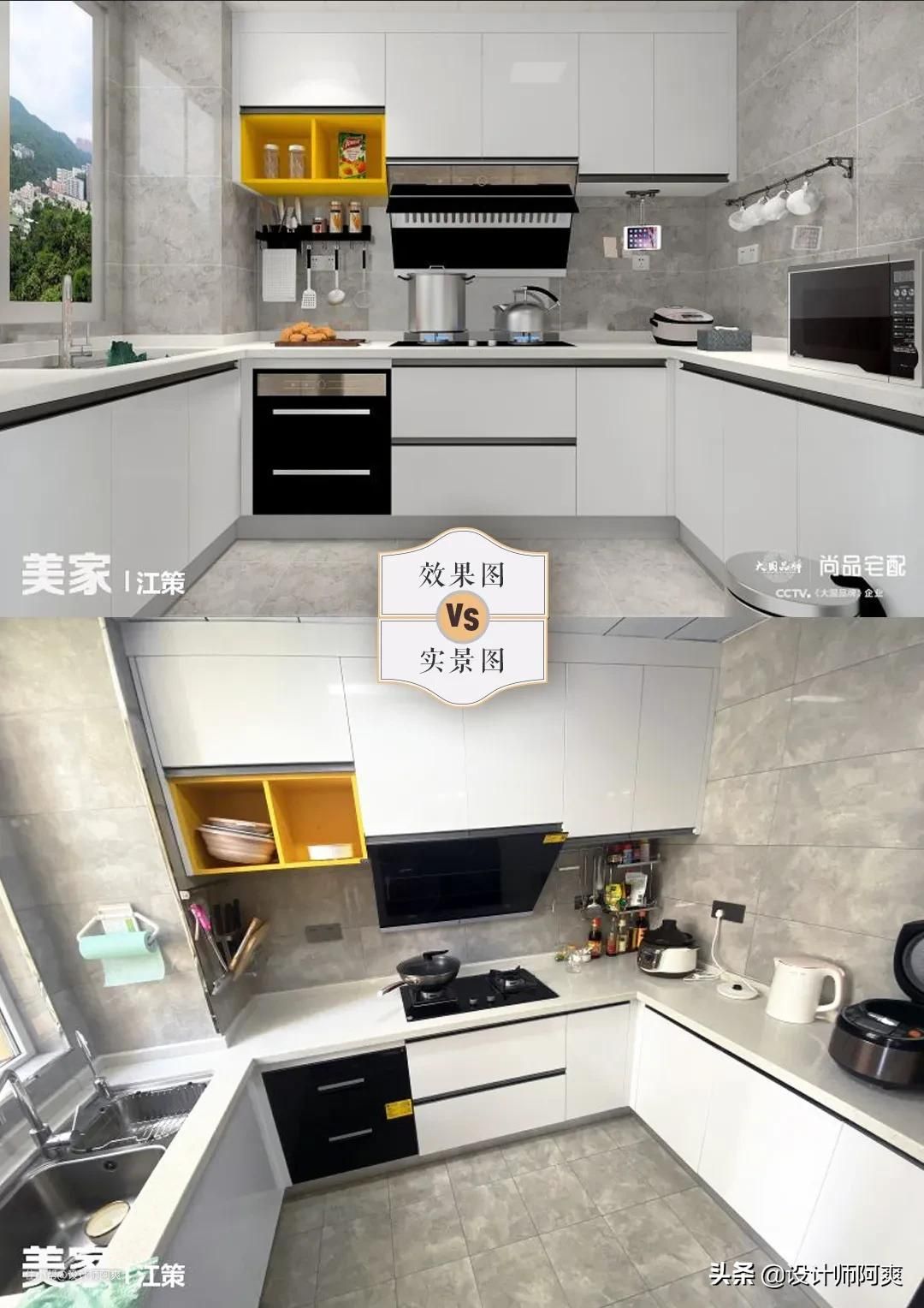 ▲长方形厨房适合L型橱柜布局,集成灶旁边的橱柜设计抽屉,装上碗碟拉篮,炒好菜后拉开抽屉就能拿到碗碟盛菜,动线合理,非常顺手。