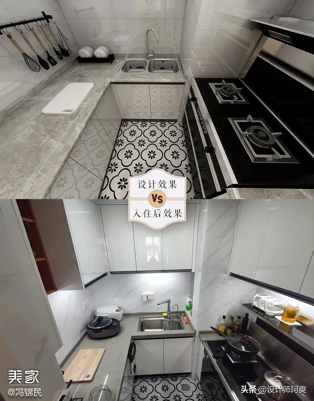 ▲厨房格局方正,适合U型橱柜布局,操作更高效便捷。灰色系瓷砖+纯白色橱柜,浅色搭配让小厨房显大又明亮。油烟机管道藏进吊柜里,整齐又美观。