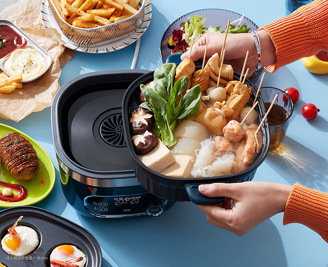 4、选配上煎盘、火锅盘这些配件,可以实现更多功能,这样就可以省下买牛排机、电火锅的钱了。