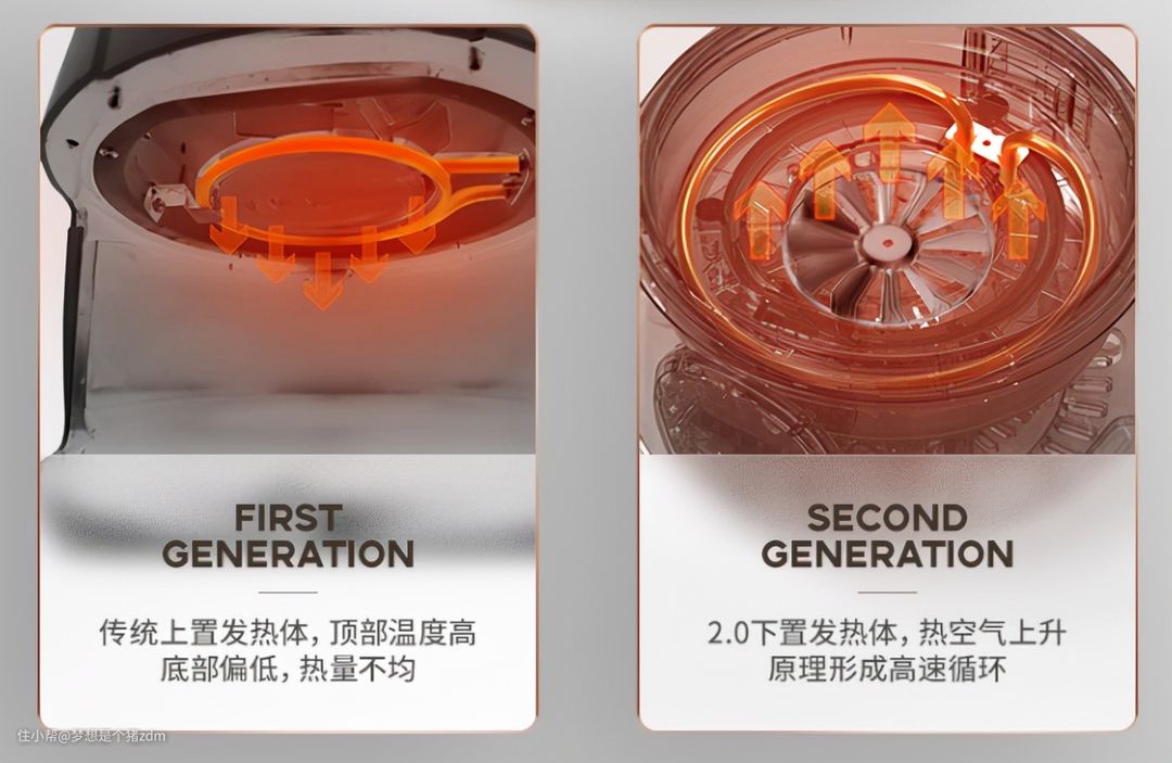 顶部加热的空气炸锅,加热管设计在食物篮上方,风扇从上往下吹风,热风从上方穿过食物后,再从食物篮底部反射。