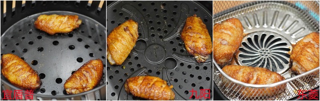 三款空气炸锅都设置为200℃,将三个鸡翅完全烤好,宜盾普用了差不多20分钟的时间,烤出来的效果非常不错,上下两面的色泽非常均匀。