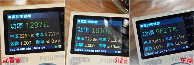 宜盾普的实时功率为1297瓦;九阳的实时功率为1610瓦;东菱的实时功率为962.7瓦。
