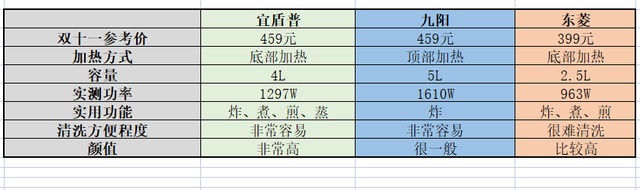 这三款空气炸锅,分别是宜盾普4L、九阳5.5L和东菱2.5L。