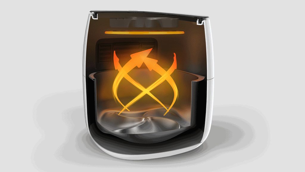 食物放置在加热篮中,热风从食物底部穿过,在从玻璃罩内向下反射,这样的好处是食物上下两面都能够得到均匀的加热,不会出现一面焦黄一面还没熟的情况。