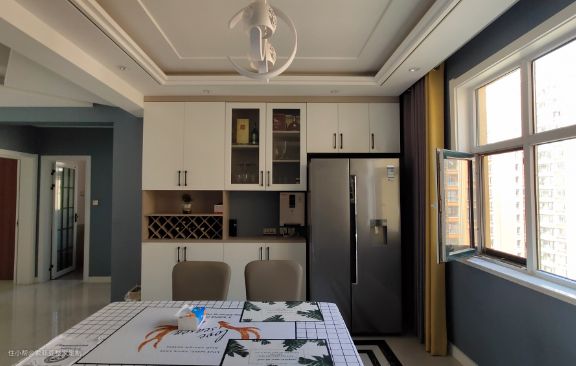 把冰箱嵌入餐酒柜中,整体协调又统一,轻松解决了冰箱单放显突兀的难题。
