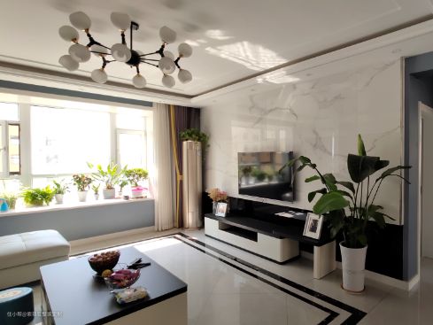 电视背景墙用大理石作为铺面,凸显高级感。背景墙和电视柜均用黑白搭配,提升客厅整体质感。