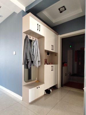 强大视觉冲击力的莫兰迪蓝墙面,搭配存在感较低的浅布纹+暖白入户柜,强与弱的中和,达到整体美观和谐的效果。