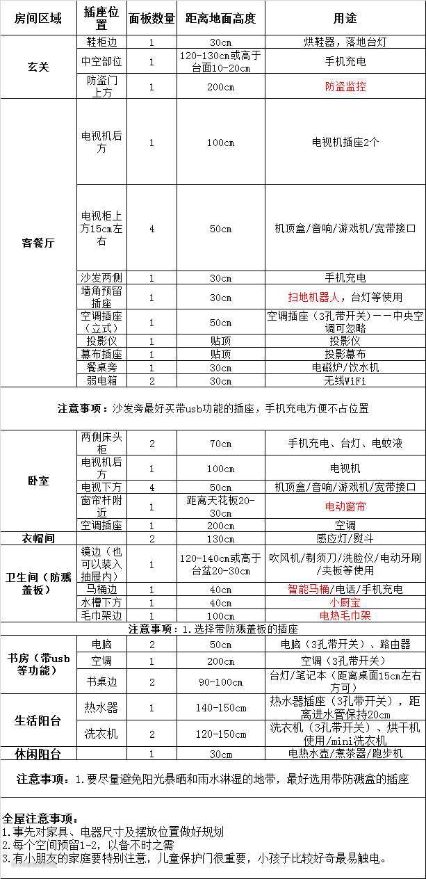 把关于家装开关和插座的布局清单给到大家,首先是插座布局: