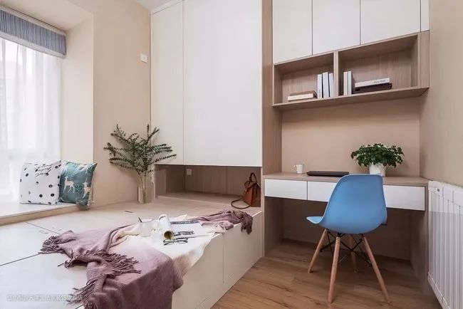 如果想要一个学习区,可以将飘窗与桌台结合,把卧室的转角空间利用起来,把飘窗设计成书桌+梳妆台,根据需求设计划分区域,再加两个抽屉收纳杂物。