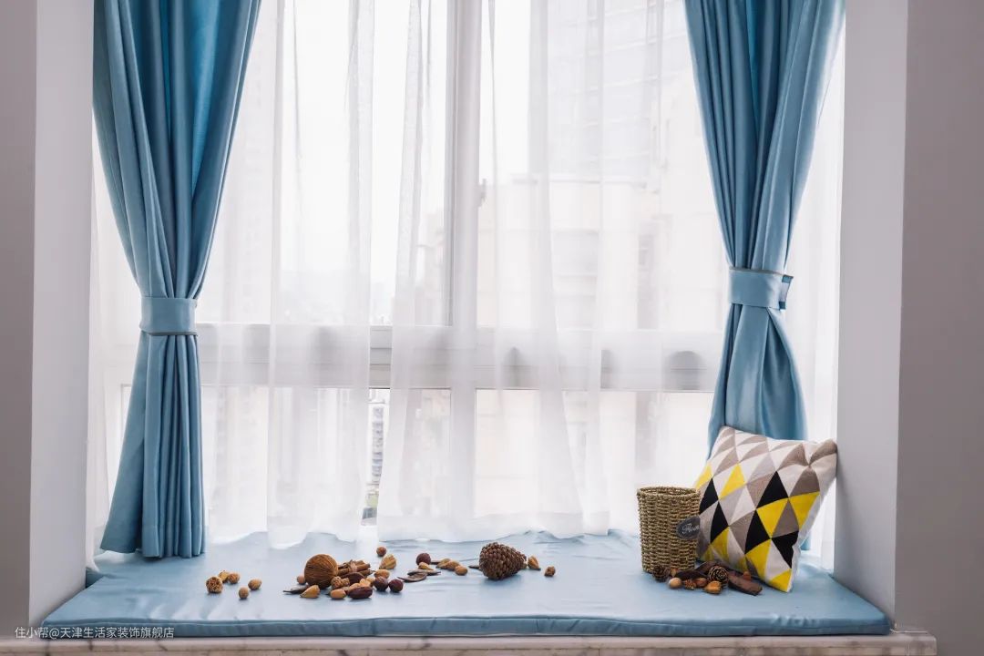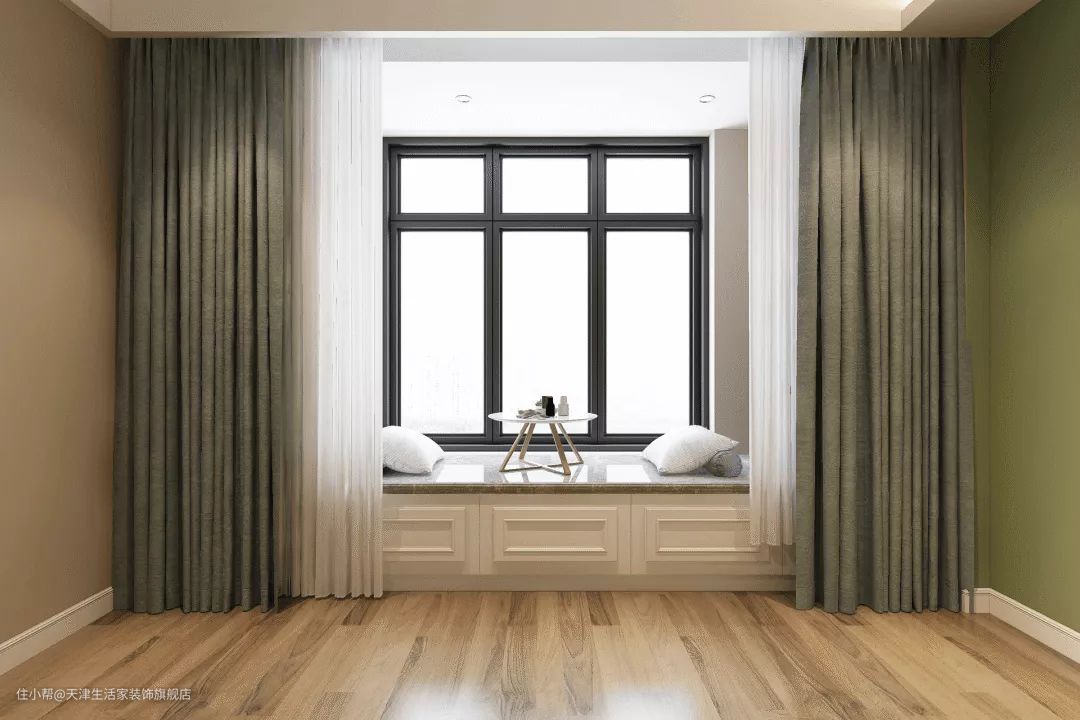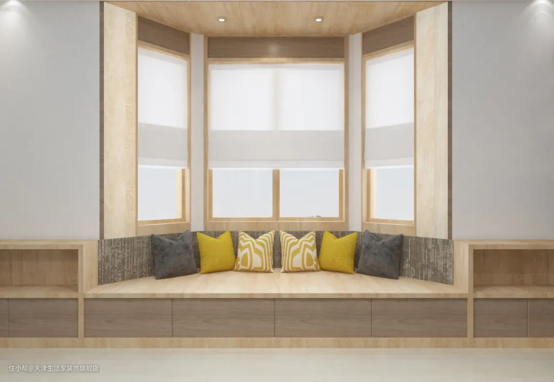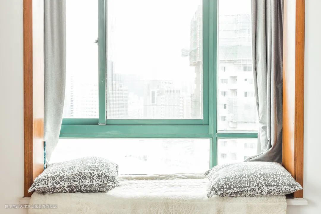 对于飘窗的台面,木材和石材都可以,看自己的喜好,搭配一个定制软垫就可以了。
