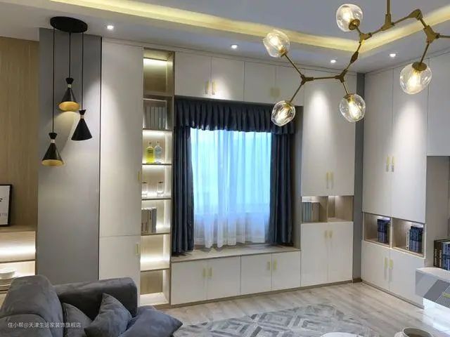 怎么选择飘窗柜?明确需求才能万无一失。如果想要收纳多一点,除了常见的地柜之外,可以选择在飘窗的两侧定制高柜,地柜+高柜组合使用,有1+1>2的效果。
