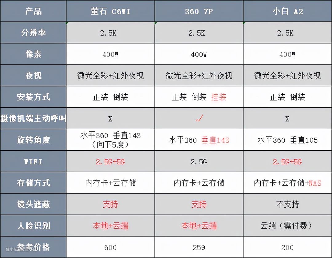总体来看,三款智能摄像头的主要画质参数:分辨率和像素是相同的,在支持的功能上略有区别,价位上呢,360 7P 与小白 A2 价位相近,萤石 C6WI 的价格就比较高。