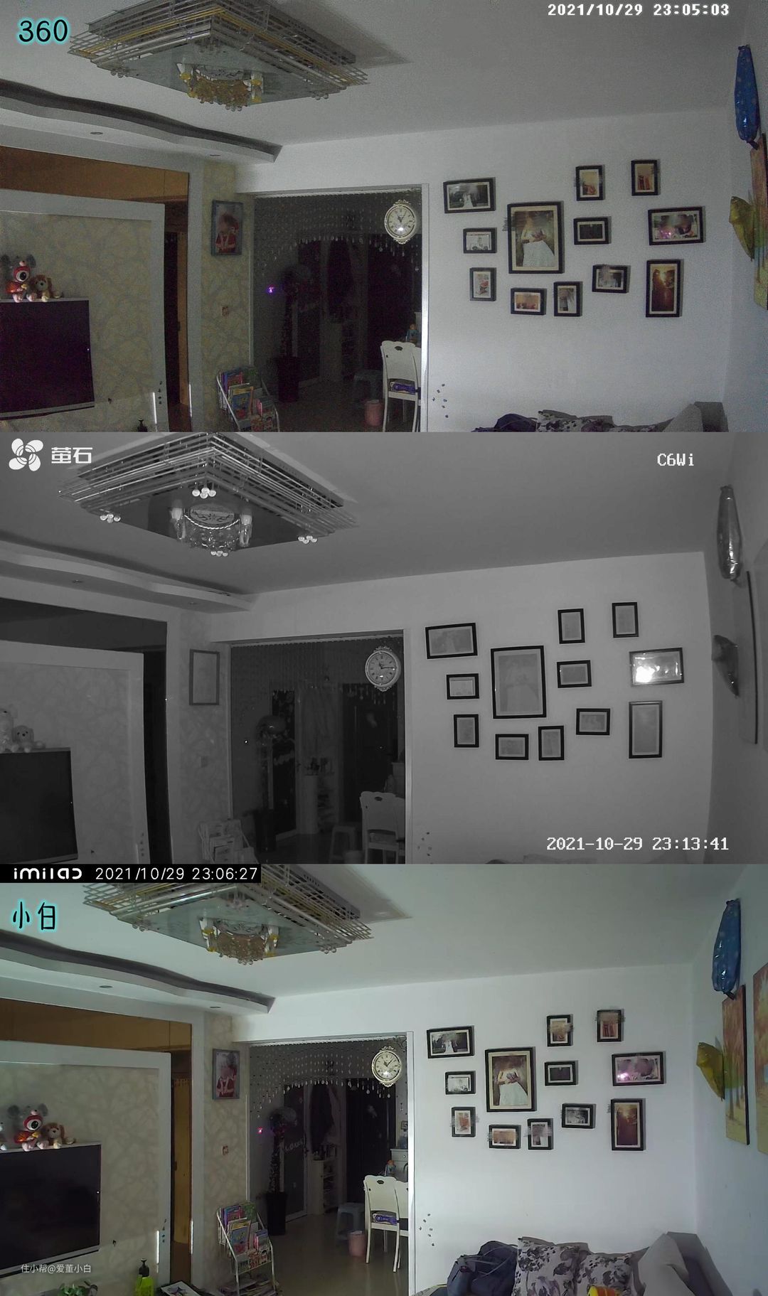 全黑红外夜视下,360 7P>>小白 A2>萤石 C6WI