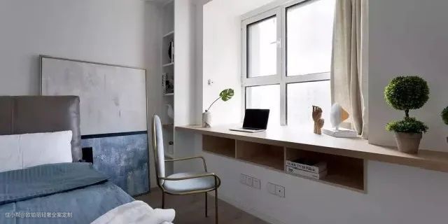 如果你有在卧室办公或学习的需求,可以把飘窗设计一张书桌,再配吊柜和书柜,功能完全学习气氛十足。