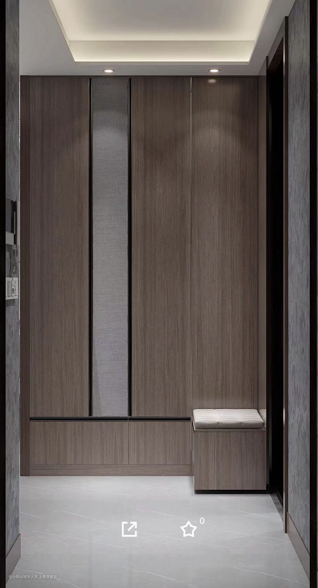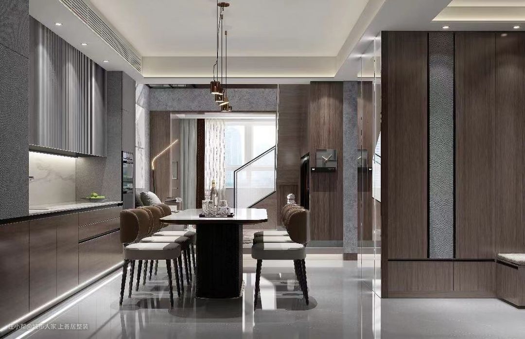 入户玄关区往往给人带来第一感受,在空间上满足储物收纳的同时,暖色系的木饰和灯光,高端大气,现代简约复式楼设计,采用大面积艺术漆,配合烤漆板及岩板饰面,交相辉映,让生活充满仪式感。