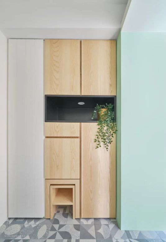 鞋柜下方加装灯条照明,天黑时不用开灯也能拿取拖鞋,同时也营造玄关气氛