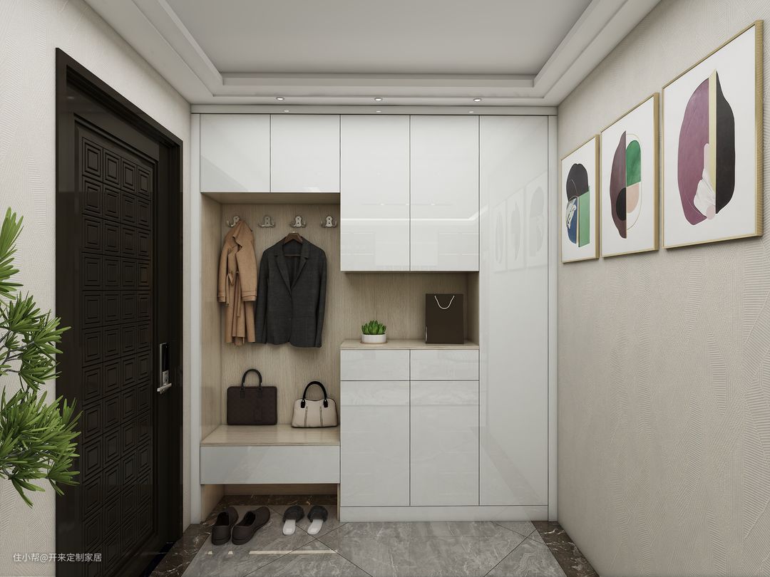 玄关 悬浮抽屉兼做卡座与置物台,上方挂放设计,下方常位鞋区,错层吊柜与地柜抽屉增添设计层次感,错落有致。这个空间虽没有设计玻璃柜,但整体在开放区与封闭区的结合中明澈通透。