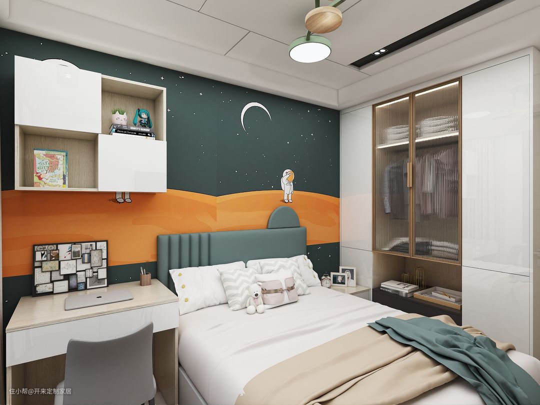 青少年房 宇航员壁纸上悬挂一方虚实结合的吊柜,即可隐藏又可展示,衣柜素白门板中间金色窄边长虹玻璃柜透视出挂放区与叠放区,下方开架置物台可以扩充床头柜功能。