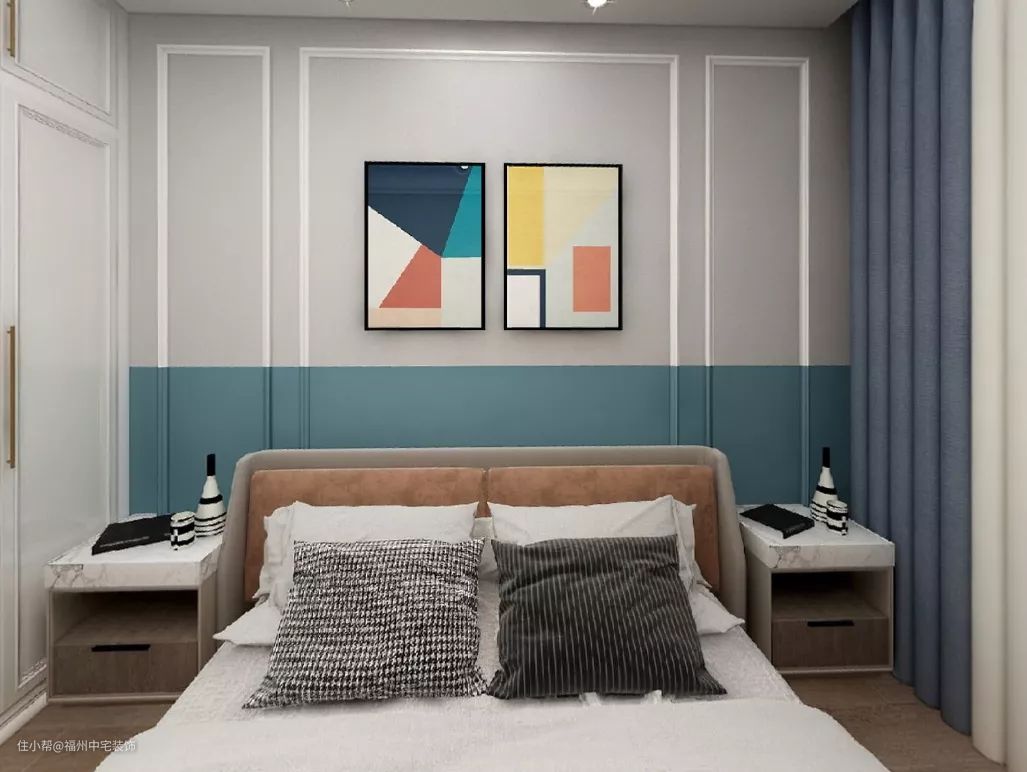 卧室区域以舒适为主,延伸至天花板的竖形石膏线,搭配绿植,全身镜,体现北欧风情之外,让空间视觉更加丰富。