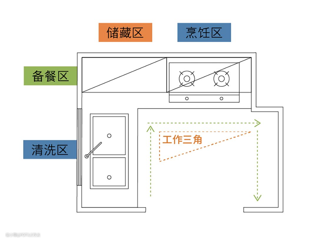 洗涤区、备餐区与烹饪区沿墙而设,形成了三角动线。