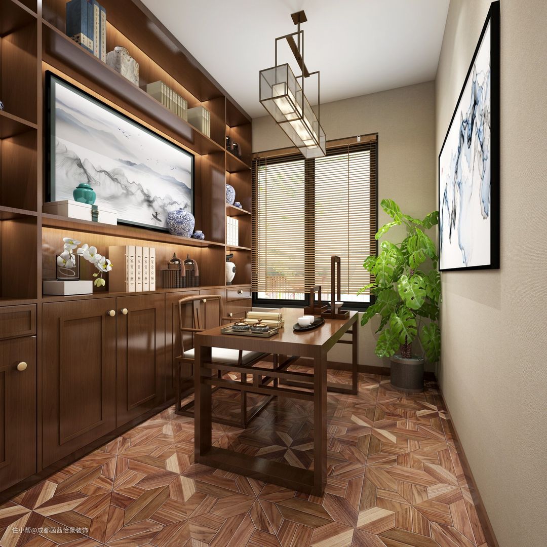 书房的设计沿用了整体的设计基调,实木的书桌与定制柜子,奠定了这个空间的中式基调,加入少许的绿植点缀,点亮了空间。