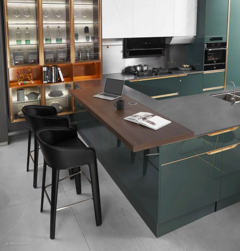 吧台的设计,将西厨空间与餐厅完美融合,可以参考图中这一款,靠里位置安装烟机、灶台等中厨设备,靠外的位置增加西厨操作台,延伸部分设计了西厨餐桌,成功打造开放式中西厨。