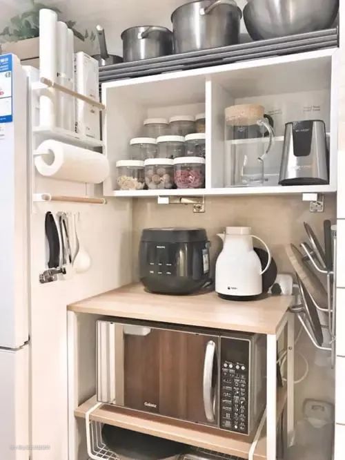 买菜回来第一件事是把它放在地上或者是台面上,要是在厨房设计时能在旁边做开放柜设计,这一切摆放的问题都得到解决,而且不会让空间变得凌乱。主要是这里还能放些瓶瓶罐罐,我们的使用也变得方便许多。