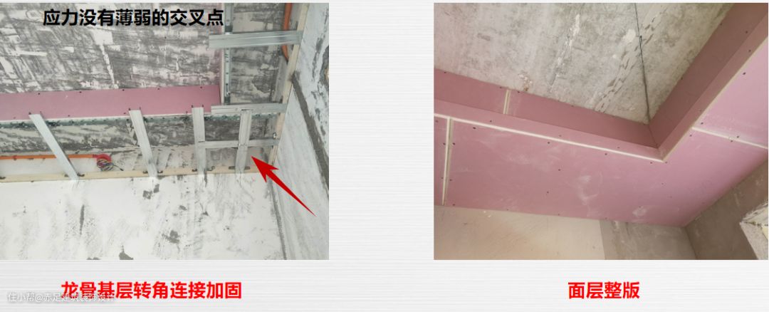▶避开石膏板直头接,嵌缝膏充分填充,减少开裂几率