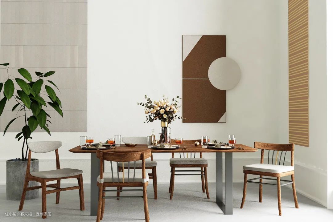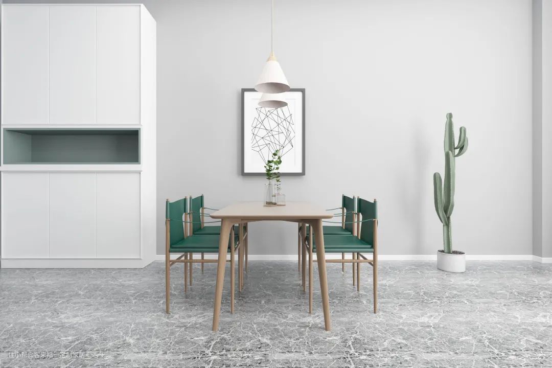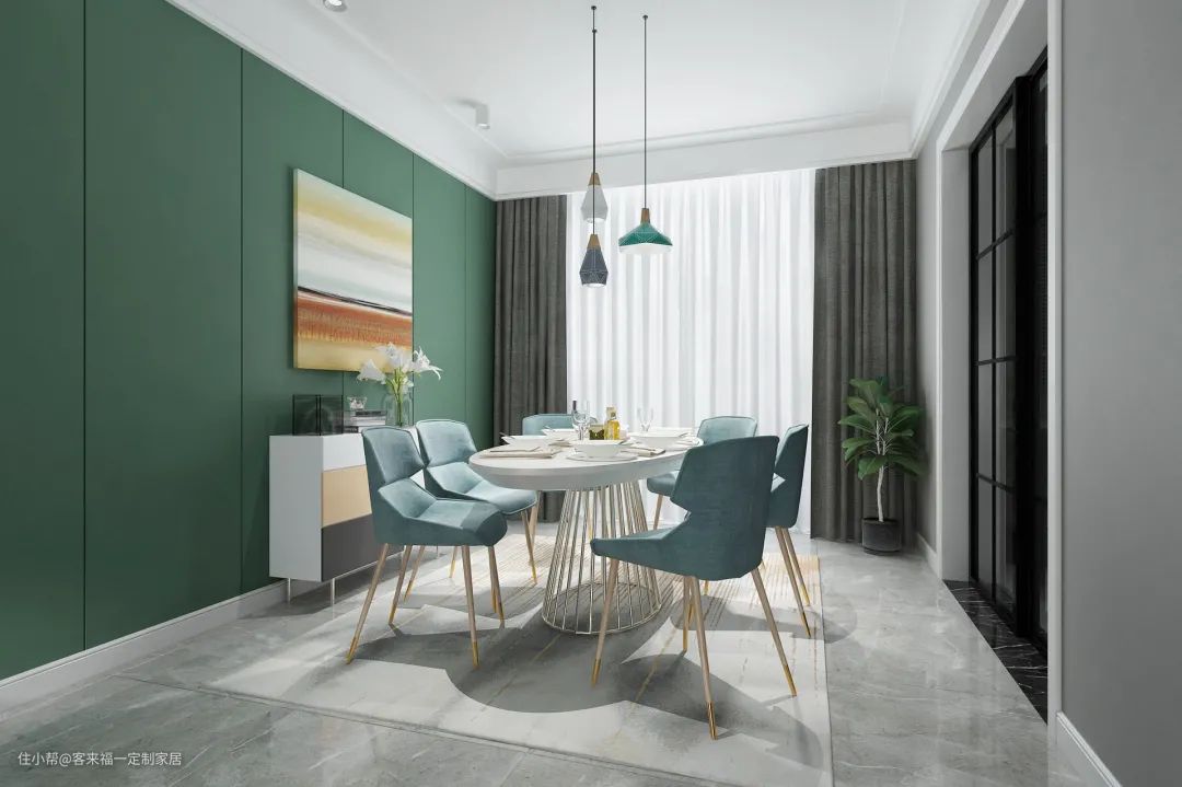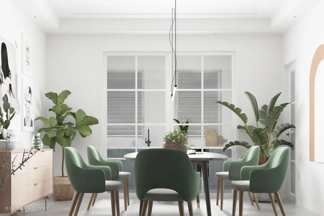 很多人担心餐厅中的设计太过于单调,这款以奶白色为主要背景,富有层次的绿色做配色就会收获非常赞的效果,百叶窗、格栅、木质餐边柜都是目前非常流行的元素,圆形的餐桌代表着中国人传统的和谐意象。橄榄绿的餐椅和绿植的颜色同为绿色系,在视觉上显得格外和谐。
