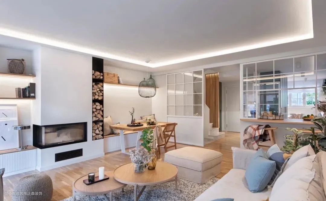 客餐厅的空间感受会更通透,同时还能增加一个多功能台面(图1)。