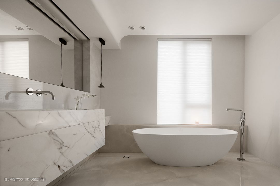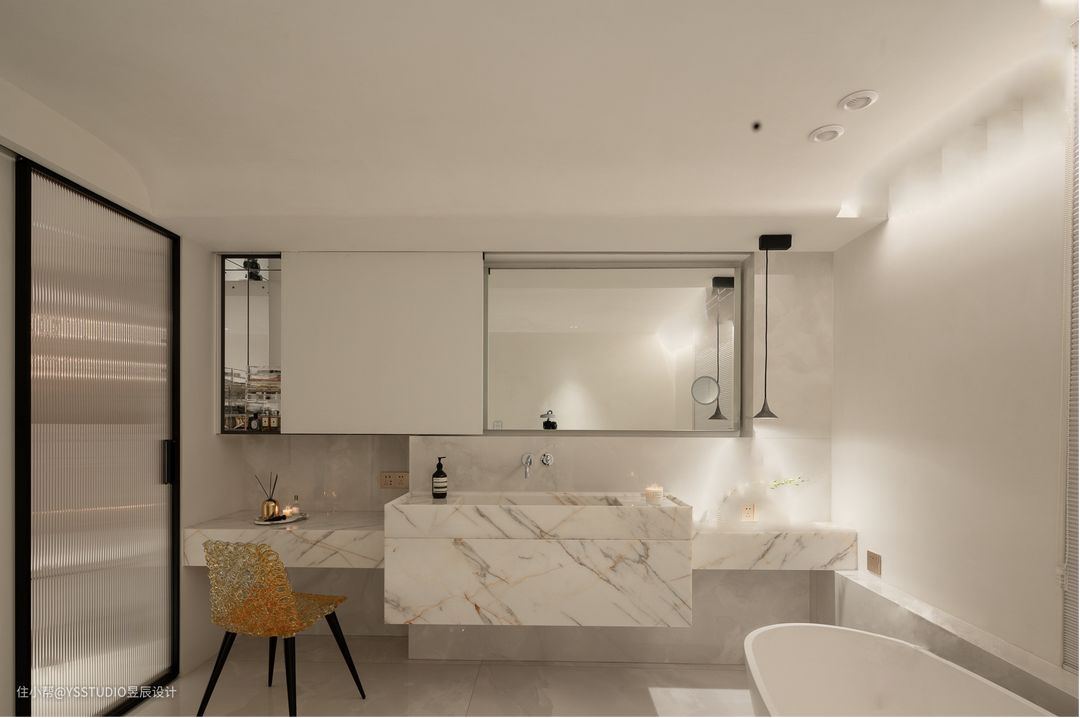 临窗是一个大浴缸,泡澡真的是女主人全身心放松的开始。 左侧其实还有专门设计的净衣区,用来处理一些有点味道但并不太脏的衣服。马桶间的磨砂移门也可两用,除了遮挡马桶区域,也可以遮挡背后要换洗的衣物。