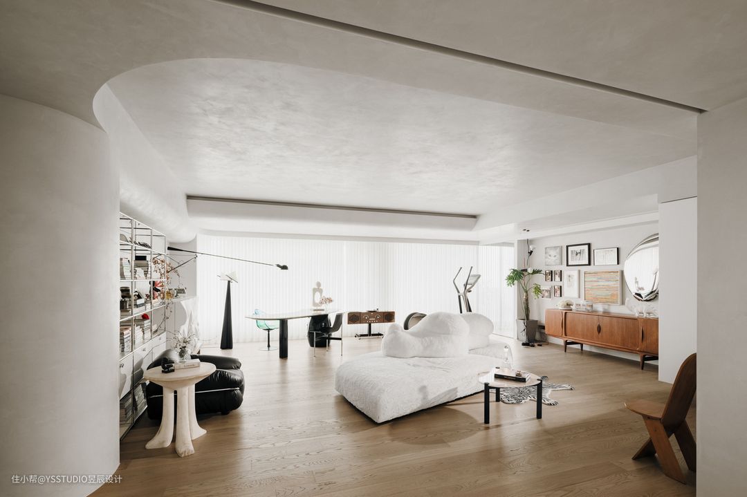 这个家也很有趣,它把“Less is more”和“Yes is more”看似矛盾的两种理念完美融合。 在硬装上,它绝对做到了Less,无踢脚线,几乎看不见的出风口,干净的吊顶和墙面,客厅区域仅几个开关控制。家具进场前它在普通人眼里好似一个半成品。而现在我们眼前的它,被屋主从世界各地淘来的中古家具和艺术品塞满。巴黎设计师的手稿画,意大利的中古杯,能进博物馆的人像折叠柜,各种稀缺的Vintage椅,全世界都没有几把。