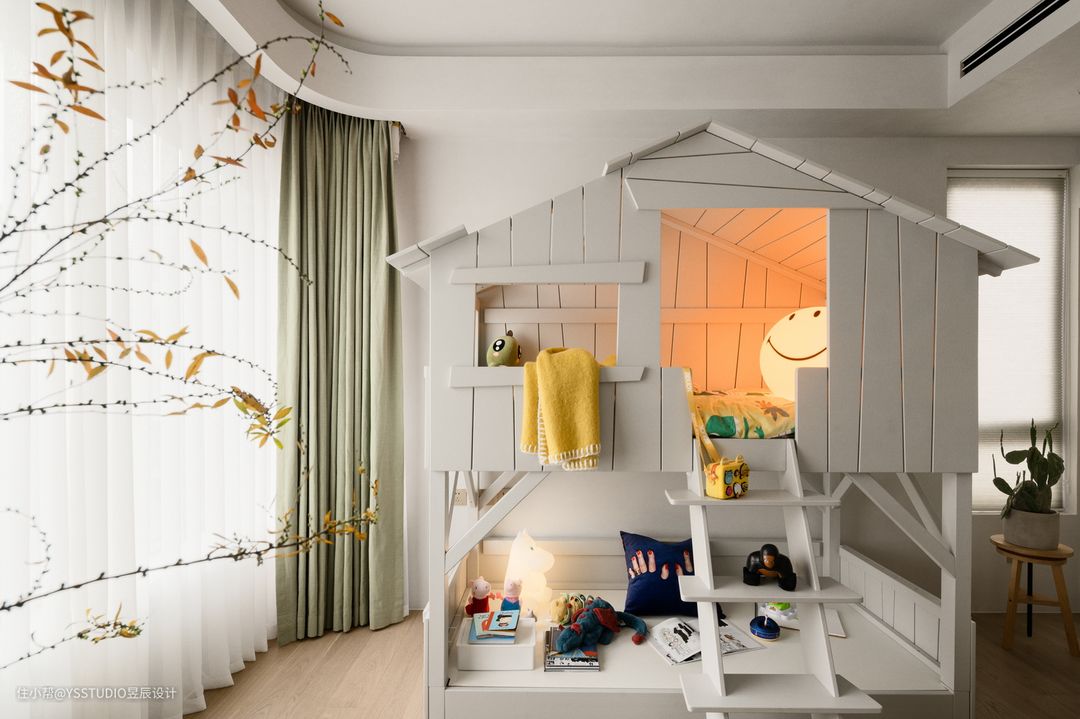 儿童房虽然也是大面积的质感漆加木地板的组合,但小物件上选择了更明亮的颜色做穿插。譬如,明黄色。在阳光稀缺的冬天让人就很温暖。恰好对上了前段时间PANTONE公布的2021流行色「亮丽黄」(llluminating)。