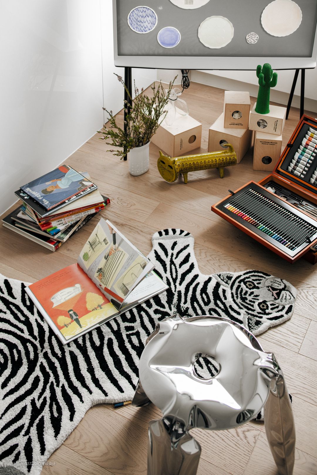 进入儿童房之前,首先步入一个画室兼具瑜伽室的公区。左侧是一排隐藏式门板,不仅有储物功能,也可以做小朋友的画板,在这里画画是可以擦掉的。