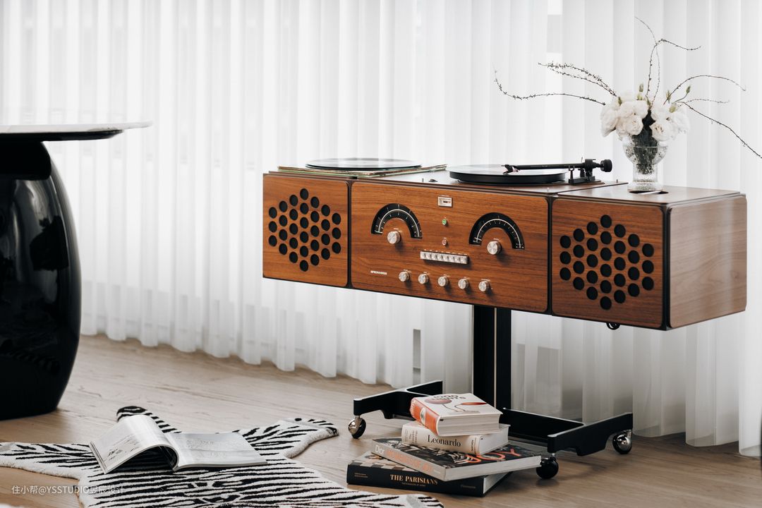 靠窗一侧,错落分布了我们自主设计的RECASA品牌 Moon Table 月亮书桌,书桌不仅美观,且自带三个圆弧形抽屉兼具收纳功能。依次,便是Brionvega微笑黑胶唱片机,被称为颜值最高的椭圆仪。 是的,设计师的家是不允许有一样东西是不好看的。 工作,音乐,健身,一个不落。