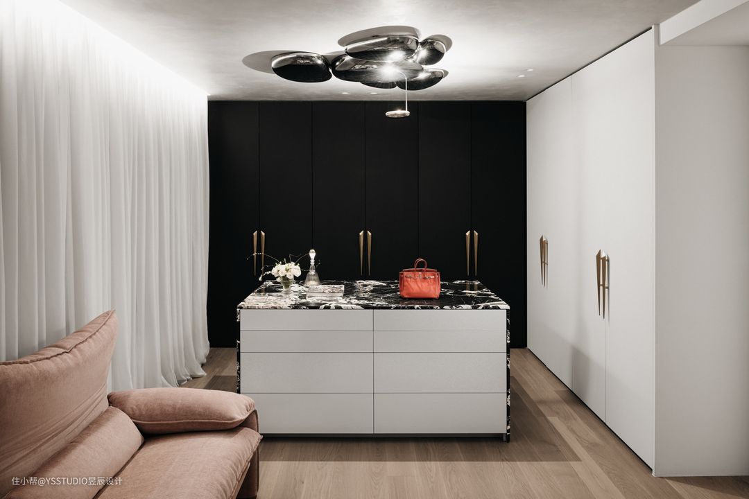 衣帽间有独立岛台,收折衣服可在岛台上实现,并且岛台本身也拥有强大的收纳功能。