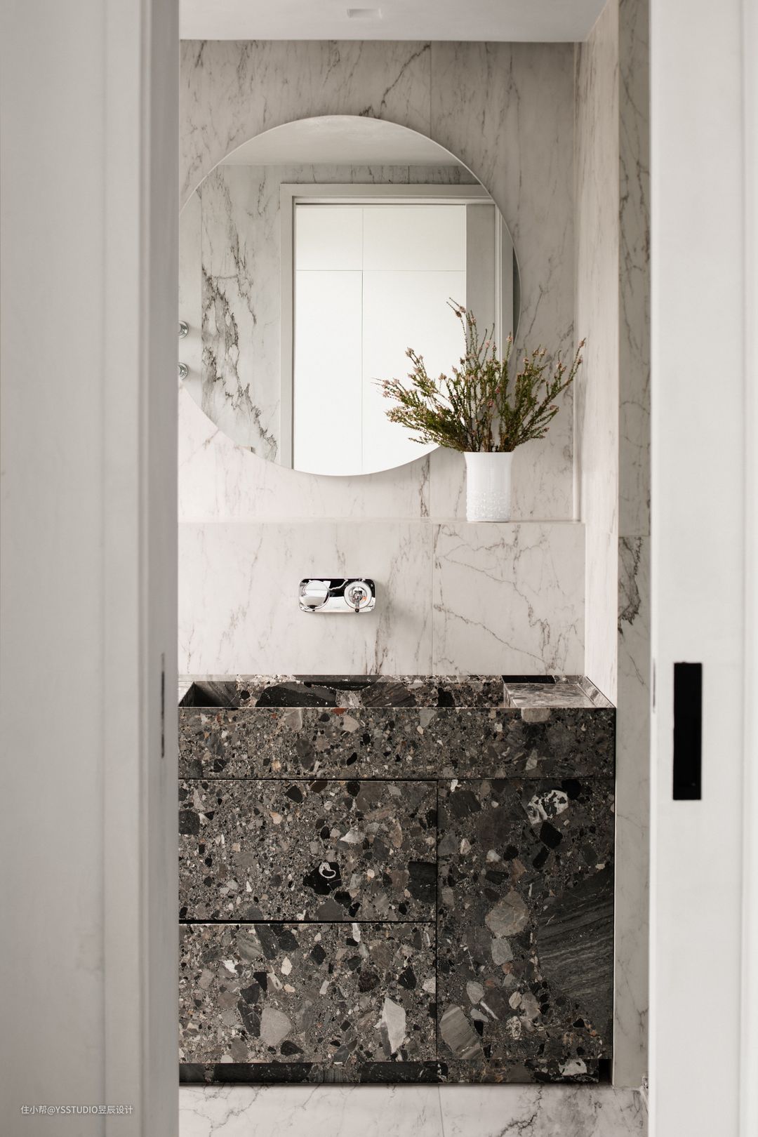 奢石的洗手台配上大理石砖,一深一浅相得益彰。